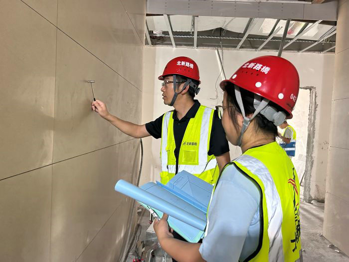 活動(dòng)中,該項(xiàng)目青年員工身著統(tǒng)一工裝、佩戴安全帽,在專業(yè)質(zhì)檢員指導(dǎo)下,手持靠尺、塞尺、空鼓錘等專業(yè)工具,嚴(yán)格依據(jù)施工圖紙及驗(yàn)收規(guī)范,對(duì)吊頂作業(yè)面、墻地磚鋪貼等關(guān)鍵工序開展質(zhì)量檢測(cè)。重點(diǎn)檢查了膩?zhàn)悠秸?、涂料涂刷均勻度、陰陽角順直度及地磚鋪貼空鼓率等核心指標(biāo)。期間,一名“體驗(yàn)質(zhì)檢員”通過空鼓錘敲擊發(fā)現(xiàn)3處地磚邊緣空鼓,現(xiàn)場(chǎng)與施工班組就砂漿飽滿度控制、敲擊檢測(cè)力度等工藝要點(diǎn)進(jìn)行深入交流,形成“發(fā)現(xiàn)問題—分析原因—協(xié)同改進(jìn)”的閉環(huán)管理模式。