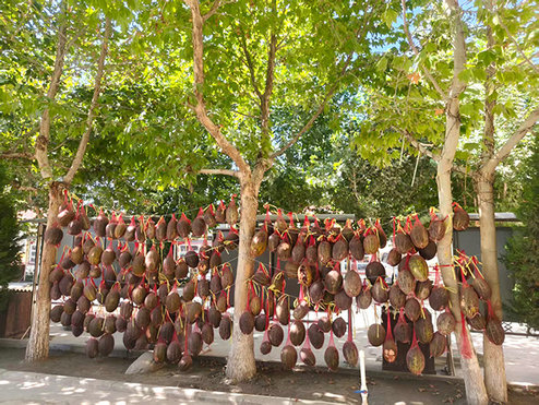 一個午后,中亞分公司的工作人員驅(qū)車抵達(dá)蘇魯克村時,只見網(wǎng)兜里的水晶瓜,一排排整齊地懸掛于樹干之間,風(fēng)動兜搖,瓜香撲鼻,成了蘇魯克村一道別致的風(fēng)景。村里的人笑著解釋道,“這可是當(dāng)?shù)氐?lsquo;土智慧’,這樣掛著,不僅通風(fēng)防潮,延長存放時間,還能讓糖分凝聚,果子就更甜了。”