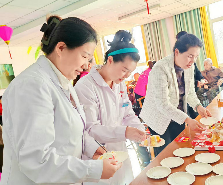 圖2為:三十里大墩醫(yī)療服務中心醫(yī)務人員,與六師奇臺農場110社區(qū)吾家樂寶養(yǎng)老院院長史云智(左一),在李文生老爺爺?shù)?ldquo;百歲生日會”中,為該院在院長者們分享生日蛋糕。