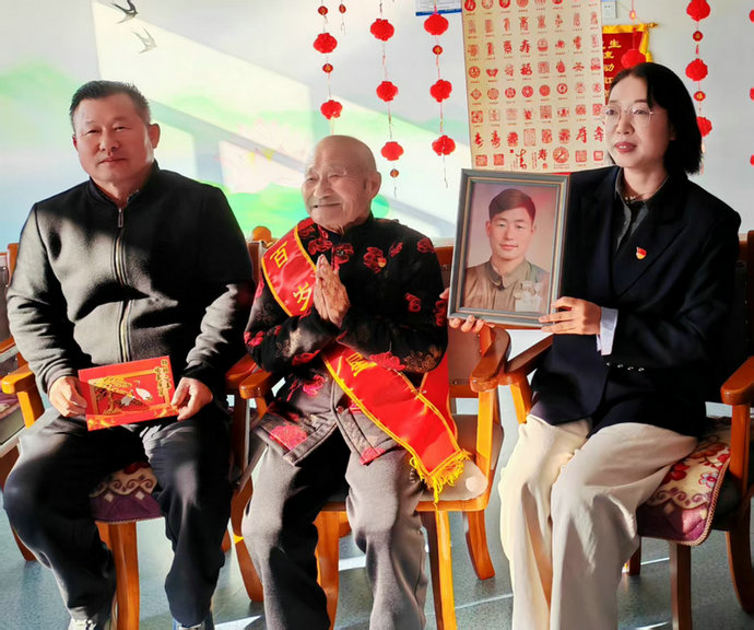 圖1為:10月18日,在開展“敬老月”活動中,三十里大墩社區(qū)王娜書記(左一)、六師奇臺農場110社區(qū)吾家樂寶養(yǎng)老院院長史云智(左三),為入住該養(yǎng)老院的百歲老爺爺李文生(左二),佩戴黨徽,送來生日祝福,為李爺爺精心籌備舉辦了“生日會”。陪伴李爺爺?shù)募胰藗優(yōu)槔顮敔斶^“期頤之壽”,讓兵團第一代建設者李文生老爺爺切身感受到了全社會的關心與關愛。