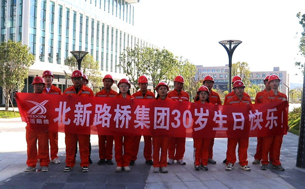 南平訊(通訊員 馬軼鋒)10月24日,福建分公司武夷新區(qū)市政項(xiàng)目員工在已建成商務(wù)工程前集體祝福北新路橋集團(tuán)成立30周年。