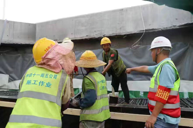黨員、副經(jīng)理張盛偉(右1)在金山寺車站施工中堅守現(xiàn)場督促工程質(zhì)量