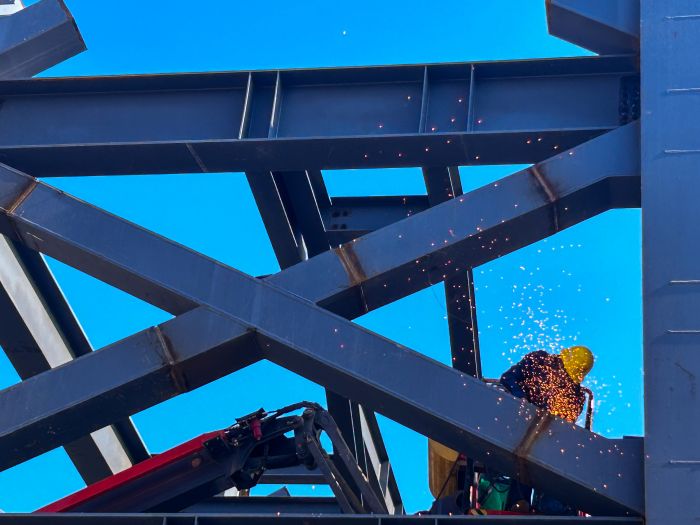 工人們散布在各處,他們裹著厚實的工裝,領(lǐng)口緊系,袖口扎牢,在寒風中勾勒出一個個沉穩(wěn)堅毅的身影。焊工李師傅蹲在三層鋼架平臺上,面前的鋼材接口早已做好精細預處理。他輕輕調(diào)整面罩位置,指尖在焊槍開關(guān)上稍作停頓,這是他三十年職業(yè)生涯養(yǎng)成的習慣,每一次焊接前,都要確認好角度與電流參數(shù),確保每一道焊縫都精準無誤。按下開關(guān)的瞬間,一束刺眼的弧光驟然劃破冷寂,金黃的焊花如煙花般四散飛濺,在寒風中劃出短暫卻絢爛的軌跡。那簇焊花帶著灼熱的溫度,落在冰冷的鋼材上,滋滋作響,悄然融化著冬日的嚴寒。