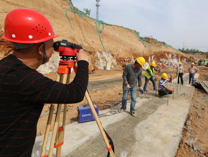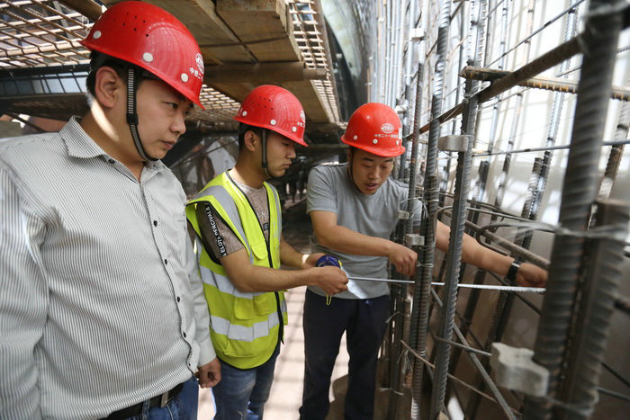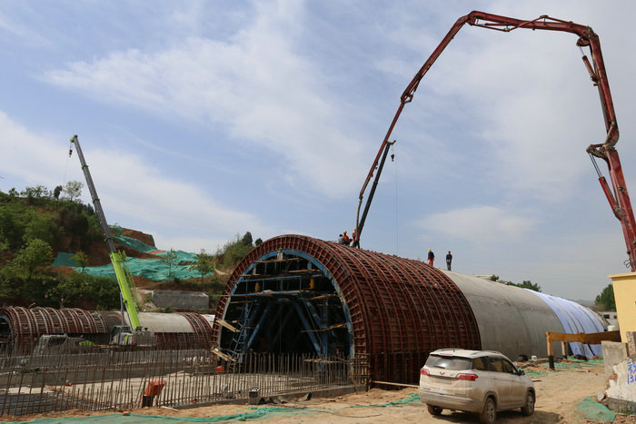 工區(qū)長(zhǎng)汪衛(wèi)(左一)、技術(shù)主管王凱崗(右一)檢查隧道邊墻鋼筋間距三工區(qū)管段4公里多,有挖方92萬(wàn)方,填方98萬(wàn)方。其中,高填方段總長(zhǎng)1.7公里,共設(shè)7座拱涵,跨徑分別為6米和11米,拱涵采用襯砌臺(tái)車施工,跨徑11米的拱涵凈空尺寸與高速公路隧道一般大小,為河南省最大跨徑的拱涵。項(xiàng)目總工張寶軍介紹:“這段高填方路基原設(shè)計(jì)為橋梁,因該段位于煤礦采空區(qū),地質(zhì)不穩(wěn),后變更為填方路基。”項(xiàng)目部工程部長(zhǎng)周鵬說(shuō):“業(yè)主要求6月底完成路基填筑,由于拱涵施工工序復(fù)雜,澆筑一板9米,5天一個(gè)循環(huán),最短的也要45天才能完工。”項(xiàng)目部班子成員與總監(jiān)徐艷軍、駐地吳兆華到現(xiàn)場(chǎng)辦公,將從這里通過(guò)的縣道034線,改到路基挖方段通過(guò),改道長(zhǎng)度600米,按縣道標(biāo)準(zhǔn)修建。改道后,完工的涵洞就可以及時(shí)填筑路基。