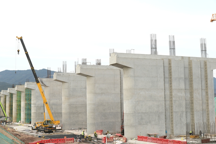 整齊排列的閘墩 贠煥軍攝接下來,該項目抓住春節(jié)前20多天的黃金時間,在做好安全防護,確保人身安全的前提下,加大人力、機械等資源投入,掀起大干高潮,力爭完成泄洪閘剩余工程量。