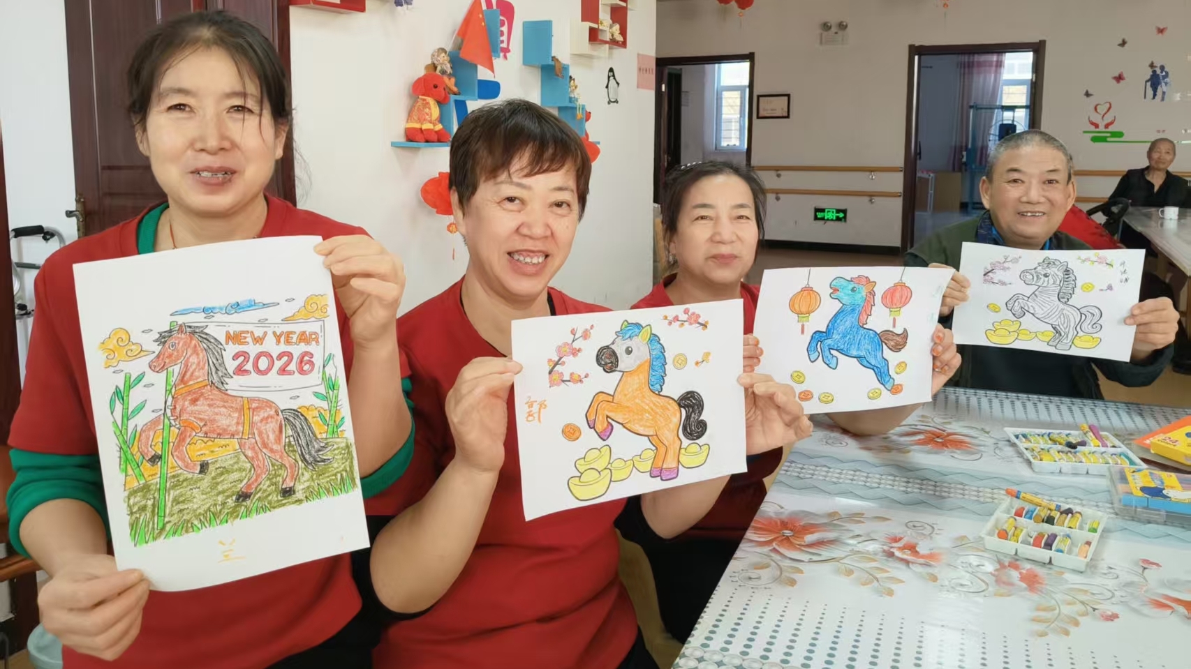 下午五時許,十余位長者圍坐桌前,手持彩色蠟筆,在畫紙上細(xì)心涂抹、認(rèn)真勾勒。一匹匹神采飛揚的駿馬、一個個飽滿圓潤的“福”字,在老人們專注的筆觸下漸漸生動。筆下有紅紅火火的新年愿景,心中是安安穩(wěn)穩(wěn)的歲月靜好。劉奶奶邊畫邊笑著說:“馬到成功,咱也沾沾喜氣,盼個健康平安!”