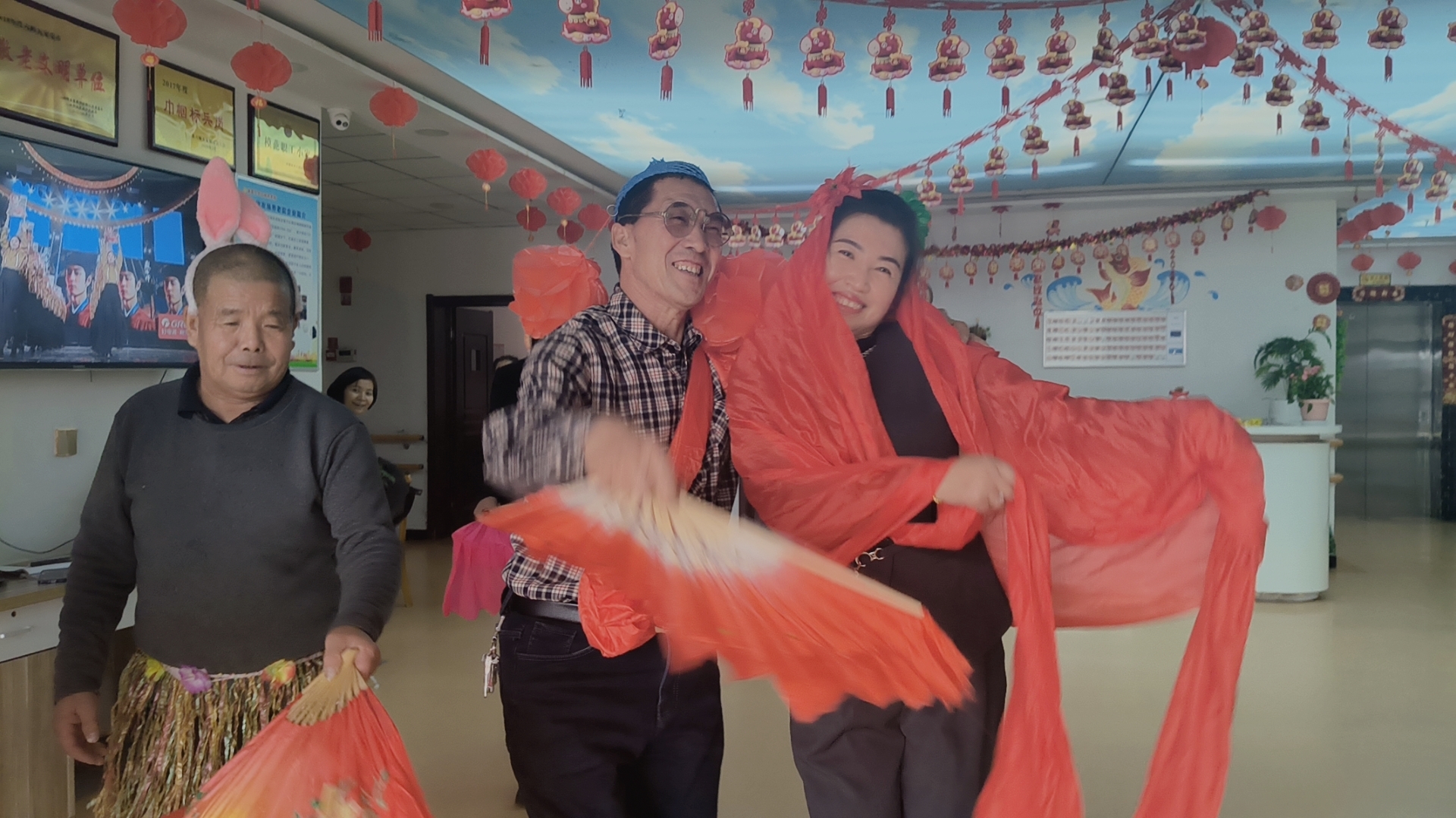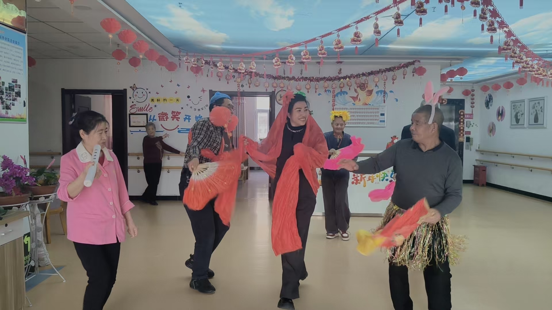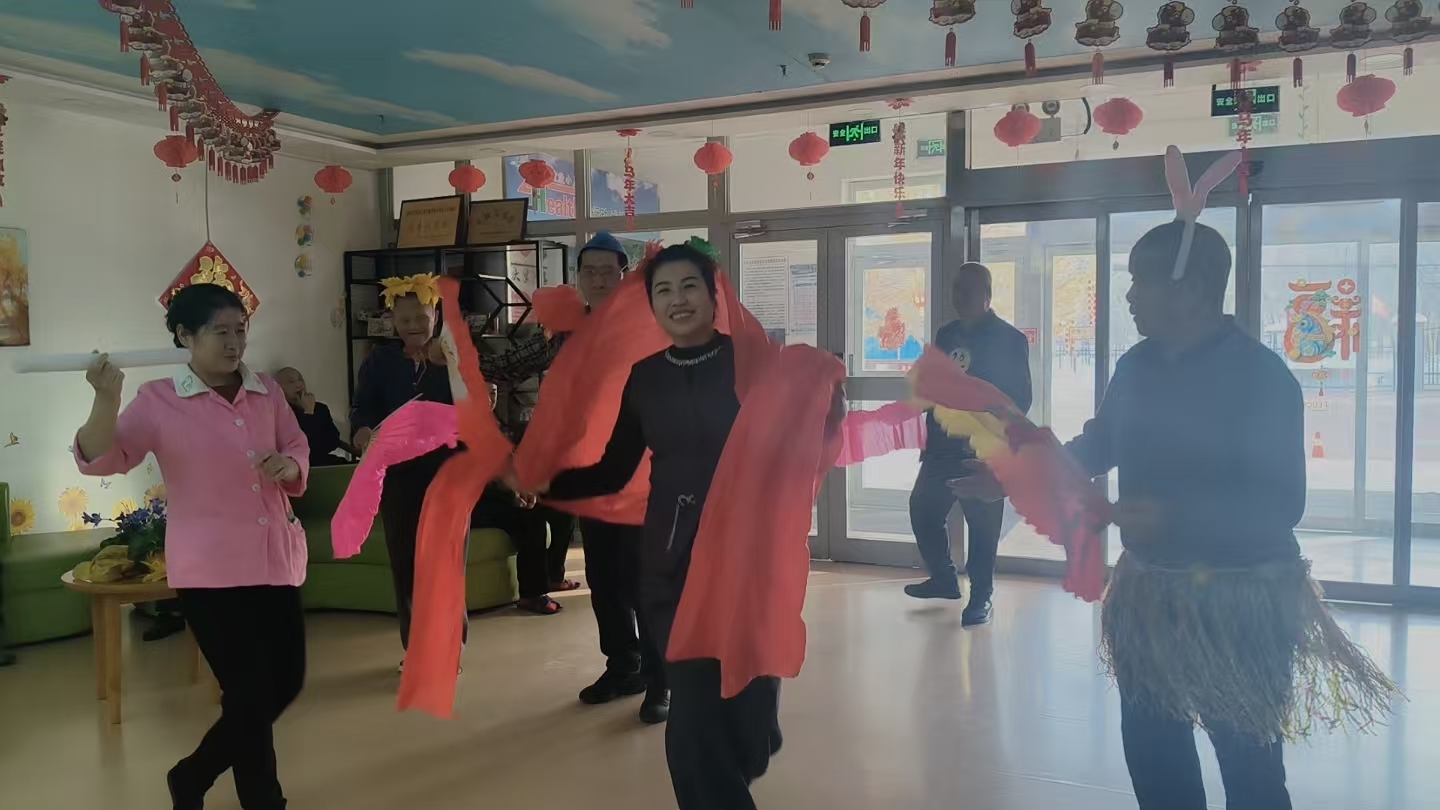 活動現(xiàn)場,喜慶的經(jīng)典民樂《抬花轎》率先奏響,明快歡騰的旋律瞬間點(diǎn)燃了全場氣氛。伴隨著這滿載吉祥寓意的節(jié)拍,由工作人員和志愿者組成的表演隊(duì)伍翩然入場。他們手執(zhí)絢麗的彩扇,舞動火紅的綢帶,踏著傳統(tǒng)秧歌的步點(diǎn),在院中翩躚起舞。彩扇如繁花綻放,搖曳生姿;紅綢似霞光流轉(zhuǎn),飄逸靈動。歡快的秧歌步伐與喜慶的音樂完美融合,構(gòu)成一幅生動熱鬧的新春畫卷。