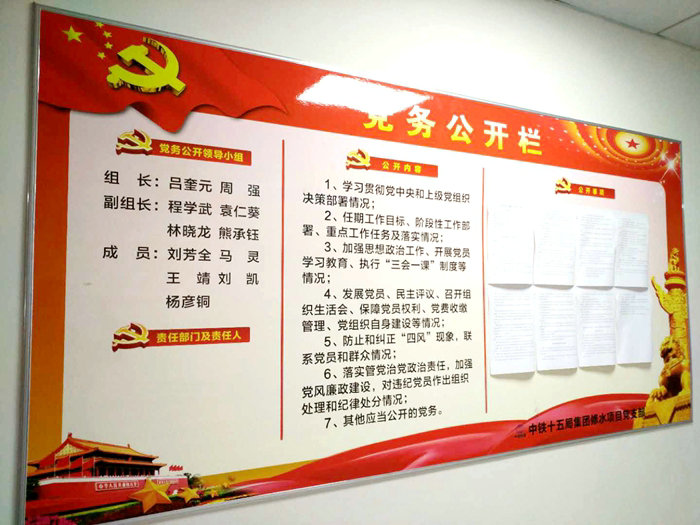 黨務(wù)公開欄修水G353項目2月份開工,工期緊、安全壓力大。黨支部充分發(fā)揮黨建工作優(yōu)勢,引領(lǐng)黨員干部提升履職能力,激發(fā)其內(nèi)在活力、敢于擔當和較強的責任心,將思想和行動集中到完成工期、安全、質(zhì)量、效益、環(huán)保計劃目標上來。黨支部按照公司黨委的工作部署和項目實際,經(jīng)過反復(fù)醞釀,推出了黨支部工作安排、創(chuàng)建四好班子實施方案、黨風廉政建設(shè)發(fā)腐敗工作要點等多項工作計劃,并有步驟地狠抓落實。首先在黨員中開展爭創(chuàng)“紅旗責任區(qū)”、“黨員先鋒崗”、“黨員之星”活動,要求每個黨員戴黨徽、亮身份、寫承諾,時刻不忘入黨誓詞和履行黨員的義務(wù)。7名黨員在管理、技術(shù)、政工等崗位上身先士卒、勇挑重擔,用榜樣的力量帶動職工戰(zhàn)勝隧道塌方等層出不窮的難題。