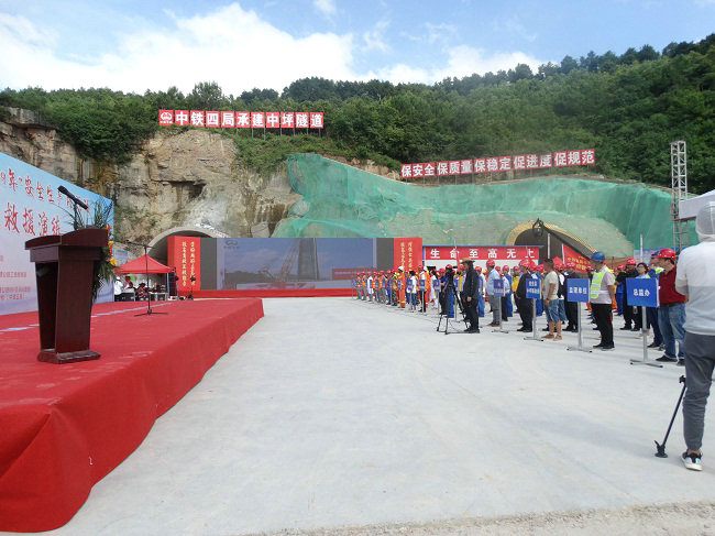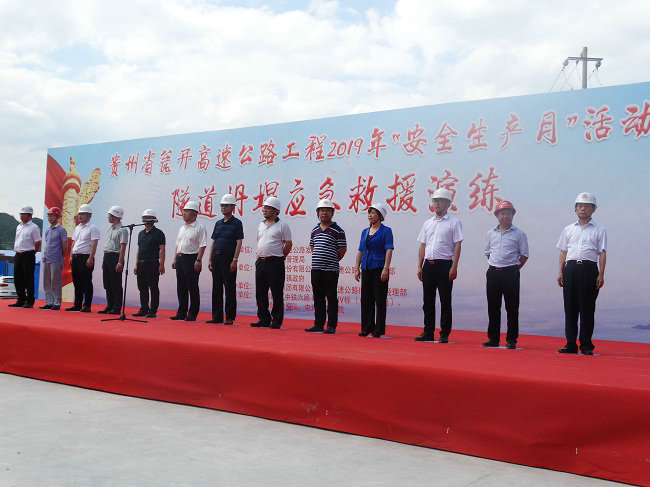 甕開高速公路中坪隧道左右雙向全長1295m,位于甕安縣中坪鎮(zhèn)境內(nèi),隧道穿越中風(fēng)化、強(qiáng)風(fēng)化白云巖,3—5級(jí)圍巖,圍巖破碎、節(jié)理裂隙發(fā)育,施工安全風(fēng)險(xiǎn)高,屬控制性重點(diǎn)隧道工程。隧道最大埋深約為130m,目前隧道雙幅已開挖700余m。下午16:00,隨著現(xiàn)場貴州甕開高速公路發(fā)展有限公司總經(jīng)理湯振山宣布演練正式開始,演練場景假設(shè)在隧道左幅出口掌子面鉆爆作業(yè),突然在距掌子面10米處拱頂發(fā)生坍塌,洞內(nèi)填充物及周邊碎石約200方坍方體,現(xiàn)場安全員與值班領(lǐng)導(dǎo)經(jīng)清點(diǎn)人數(shù),發(fā)現(xiàn)1人輕傷、2人下落不明后,立即向項(xiàng)目經(jīng)理后,及時(shí)匯報(bào)應(yīng)急救援臨時(shí)指揮部,啟動(dòng)應(yīng)急預(yù)案,幾支救援隊(duì)伍按照臨時(shí)指揮部統(tǒng)一調(diào)度,整個(gè)救援演練經(jīng)過1時(shí)的過程有條不紊,實(shí)施逃生管道為主、人機(jī)配合為輔的救援方式開展。活動(dòng)演練人員分為治安保衛(wèi)組、技術(shù)方案組、醫(yī)療救護(hù)組、搶險(xiǎn)救援組、新聞信息組,演練分別進(jìn)行了發(fā)現(xiàn)險(xiǎn)情、及時(shí)報(bào)告、分析研究、情況處置、行動(dòng)救援、信息發(fā)布、領(lǐng)導(dǎo)點(diǎn)評(píng)等多個(gè)環(huán)節(jié),整個(gè)過程人員組織、行動(dòng)迅速、坍方清除,傷員醫(yī)護(hù),專業(yè)有序,應(yīng)急演練達(dá)到如期效果中圓滿結(jié)束。