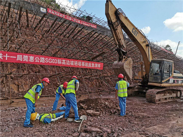 6月20日,中鐵十一局二公司莞惠公路樟謝段SG03標(biāo)項目經(jīng)理部,以《高邊坡塌方事故應(yīng)急救援預(yù)案》為依據(jù),本著“貼近實戰(zhàn)、周密組織、突出重點(diǎn)、注重實效”的原則,通過實際演習(xí),檢驗應(yīng)急指揮機(jī)制、預(yù)案及相關(guān)措施,鍛煉救援隊伍,提高莞惠公路SG03標(biāo)項目經(jīng)理部處理工程建設(shè)事故的整體水平和應(yīng)急搶險的能力為目的,開展了高邊坡坍塌事故應(yīng)急演練。