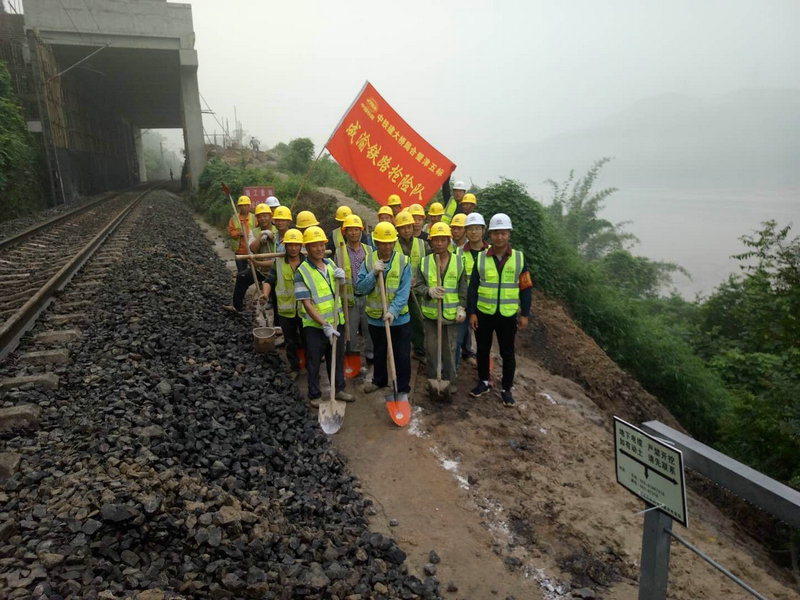 由于情況緊急,鐵路部門已封閉鐵路,暫停通車,并向我單位請求支援。我單位接到鐵路部門求援后,立即啟動抗洪搶險(xiǎn)應(yīng)急預(yù)案,停止一切施工,組織現(xiàn)場全體人員組成搶險(xiǎn)隊(duì),趕赴救援現(xiàn)場,配合鐵路部門進(jìn)行搶險(xiǎn)工作。由于此段鐵路緊鄰山體和長江,一切救援車輛和物資均無法到達(dá)搶險(xiǎn)現(xiàn)場,搶險(xiǎn)隊(duì)員迅速克服一切困難,就地取材,采用人工堆碼沙袋的方法加固沖垮的路基邊坡,保護(hù)好通信電纜,采用手提和肩挑橡膠桶的方式清理水溝的泥沙。