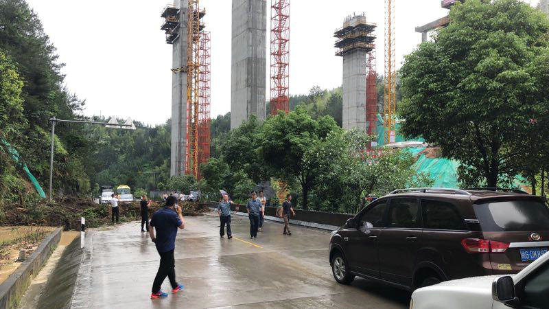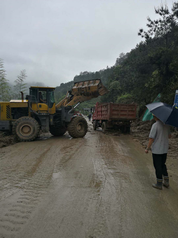 下午14時(shí),306省道發(fā)生二次泥石流山體塌方事故,沿線大大小小共計(jì)10處道路邊坡滑坡,造成堵塞交通。項(xiàng)目再次出動(dòng),緊急組織26名抗洪搶險(xiǎn)突擊隊(duì)成員、2臺(tái)鏟車、1臺(tái)挖機(jī)、5臺(tái)自卸車、1臺(tái)灑水車、立即趕往事故發(fā)生地進(jìn)行搶修,三明市廣平鎮(zhèn)政府、派出所、大田管理處、YJ5總監(jiān)辦監(jiān)理相關(guān)領(lǐng)導(dǎo)聞?dòng)嵑蠹皶r(shí)趕到現(xiàn)場(chǎng),參與到抗洪搶險(xiǎn)的隊(duì)伍中。此時(shí),狂風(fēng)暴雨,電閃雷鳴,現(xiàn)場(chǎng)搶險(xiǎn)工人沒有一個(gè)人退縮,干勁十足么,但雨量大,來速快,洪水來勢(shì)兇猛,一輛挖掘機(jī)正在處理堵塞道路時(shí),山體再次垮塌,泥石流一涌而下,司機(jī)師傅迅速做出反應(yīng),跳下操作駕駛位,但巨大的沖擊力將挖掘機(jī)沖到道路對(duì)面山溝下,險(xiǎn)釀成人員傷亡事故。此時(shí),如果不迅速清理堵塞,將邊坡加固,那么危險(xiǎn)將隨時(shí)可能發(fā)生,廣平鎮(zhèn)政府搶險(xiǎn)工作組與項(xiàng)目部研究后決定集中人力物力深入抗洪救災(zāi),快速完成搶險(xiǎn)工作,項(xiàng)目增加19名突擊隊(duì)隊(duì)員、2臺(tái)鏟車、6臺(tái)自卸車、1臺(tái)灑水車、1臺(tái)180噸吊車,聯(lián)合地方救援力量,爭(zhēng)分奪秒,冒雨奮戰(zhàn)了近6個(gè)小時(shí),終于完成了清理道路、加固邊坡堤身的搶險(xiǎn)任務(wù),及時(shí)化解險(xiǎn)情,恢復(fù)現(xiàn)場(chǎng)道路交通。