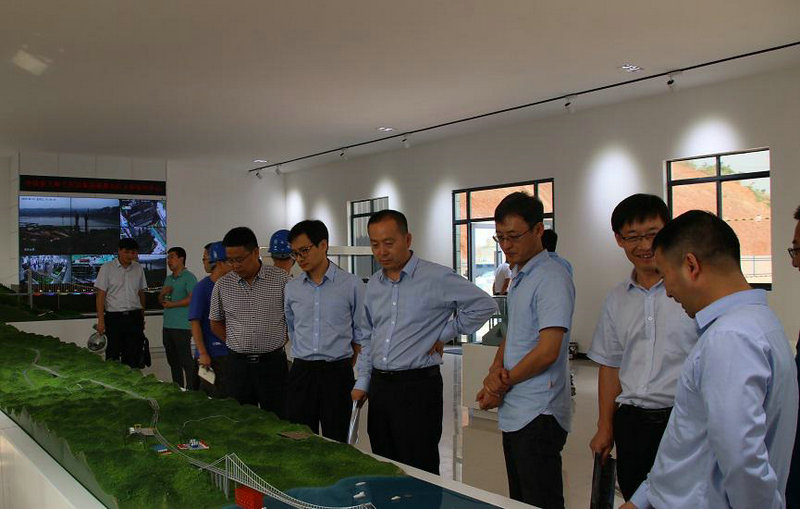 調研組首先參觀了合璧津五標的科技創(chuàng)新工作室兼油溪長江大橋安全監(jiān)控中心。在工作室內,油溪長江大橋全息幻影成像和錨碇單體模型等智能化應用展示引起了調研組的興趣。通過圖文并茂的功能展示,結合油溪長江大橋和整體線路的沙盤模型,調研組對合璧津高速項目的整體施工布局和總體施工規(guī)劃有了直觀的認知;監(jiān)控大屏播放的施工動畫,詳細講解了油溪長江大橋的施工重難點、標準化規(guī)劃建設及具體的施工方案,結合科技創(chuàng)新工作室沙盤模型等規(guī)劃設計的直觀展示,調研人員對合璧津高速公路項目有了清晰的了解,對安全監(jiān)控中心可以實時監(jiān)控現(xiàn)場施工,時時為安全施工保駕護航的作用表示了贊嘆。
