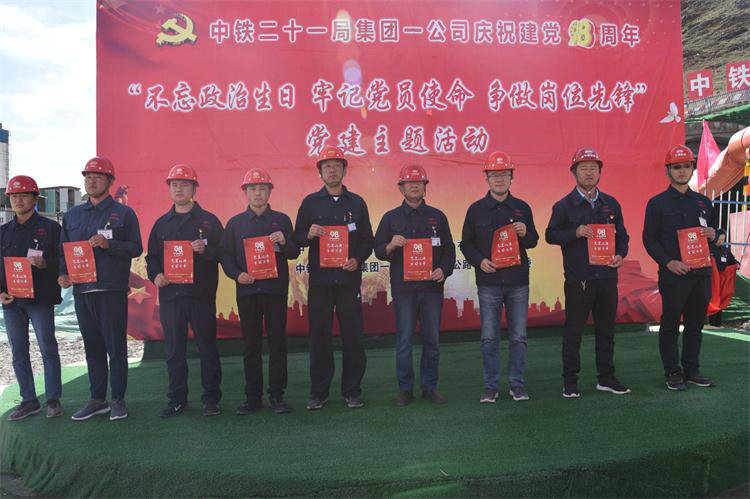 為慶祝建黨98周年,6月26日,中鐵二十一局一公司黨委在京新高速公路項(xiàng)目部大石頭隧道工地,開展了“不忘政治生日 牢記黨員使命 爭做崗位先鋒”黨建主題活動(dòng)。