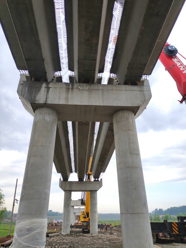 據(jù)了解,該橋全長281.08米, 橋面寬8米,兩側(cè)設置0.5米寬防撞墻,共計箱梁37片。其中第8孔跨越既有濱綏鐵路,線間距為4.25米,軌面至梁底的高度為6.8米。上部結(jié)構(gòu)采用2-20米+5-25米+30米+4-20米預力混凝土簡支小箱梁,梁高1.6米。頂寬中梁2.4米、邊梁2.4米,底寬1.0米。下部結(jié)構(gòu)采用柱式橋墩,鉆孔灌柱樁基礎,橋墩柱直徑1.3米,橋墩樁基直徑1.5米??缇€孔柱徑1.4米、樁徑1.6米,樁基類型為摩擦樁。橋臺采用肋板式橋臺,工字型承臺,樁基礎,樁徑為1.2米。橋墩均設置地系梁橫向聯(lián)結(jié),全橋蓋梁采用鋼筋混凝土結(jié)構(gòu)。