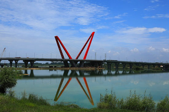 藍(lán)天碧水間,艷紅色斜拉橋跨越微波蕩漾的淠河,多角度呈現(xiàn)正“V”字型或倒“V”字型,象征著將軍之鄉(xiāng)、勝利之城六安奮發(fā)向上的新時(shí)代精神。大橋全長(zhǎng)845米,主橋長(zhǎng)178米,標(biāo)準(zhǔn)寬度為47米,雙向6車(chē)道。大橋?qū)儆陔p向大傾角無(wú)背索斜塔斜拉橋,兩個(gè)非對(duì)稱(chēng)斜塔與橋面的縱向傾角為58度,是國(guó)內(nèi)最大的傾角斜塔,主塔上塔柱垂直高70米,副塔上塔柱垂直高50米,下塔柱高約18.5米。兩個(gè)塔的橫向傾角是103度和101度。共設(shè)置24對(duì)48根斜拉索。其獨(dú)特造型在國(guó)內(nèi)絕無(wú)僅有,仿佛一座建筑藝術(shù)品。