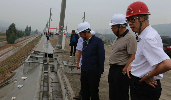 圖為銀西公司副總經(jīng)理馬新民(右一)檢查路基電纜槽質(zhì)量