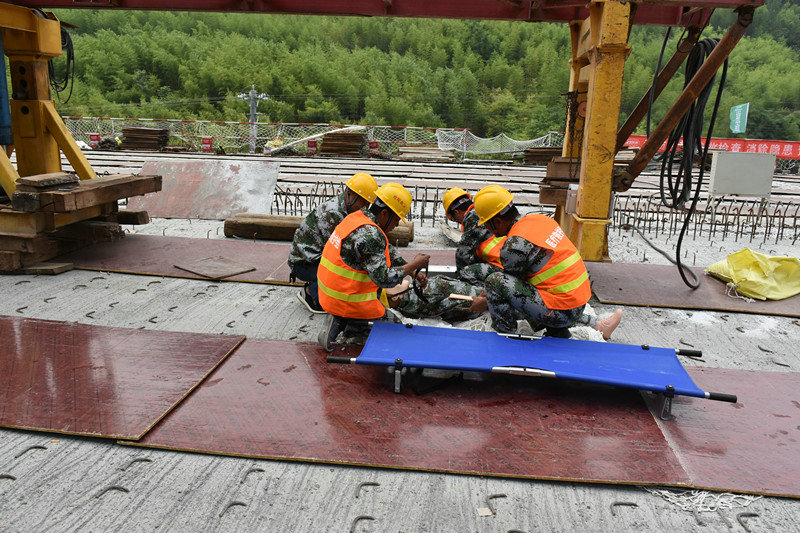 本次演練事故事是由攔魚河5#橋橋面上的架橋機(jī)電纜老化,引起配電箱著火造成電器火災(zāi),現(xiàn)場發(fā)現(xiàn)著火點的人員呼救,另一名施工人員在橋梁施工,由于情況緊急驚慌失措不慎從架橋機(jī)上掉到橋面。根據(jù)事故情況,項目部啟動專項應(yīng)急預(yù)案,根據(jù)專項應(yīng)急預(yù)案,本次有7個小組參與實施救援,救援分6個步驟進(jìn)行,每個小組人員都已最快的速度抵達(dá)現(xiàn)場,并進(jìn)行施救,整個演練過程有條不紊推進(jìn),受傷人員在最短的時間內(nèi)送往醫(yī)院進(jìn)行治療,未有生命安全。