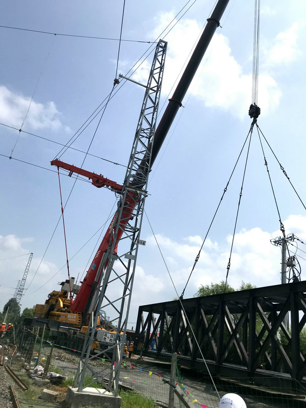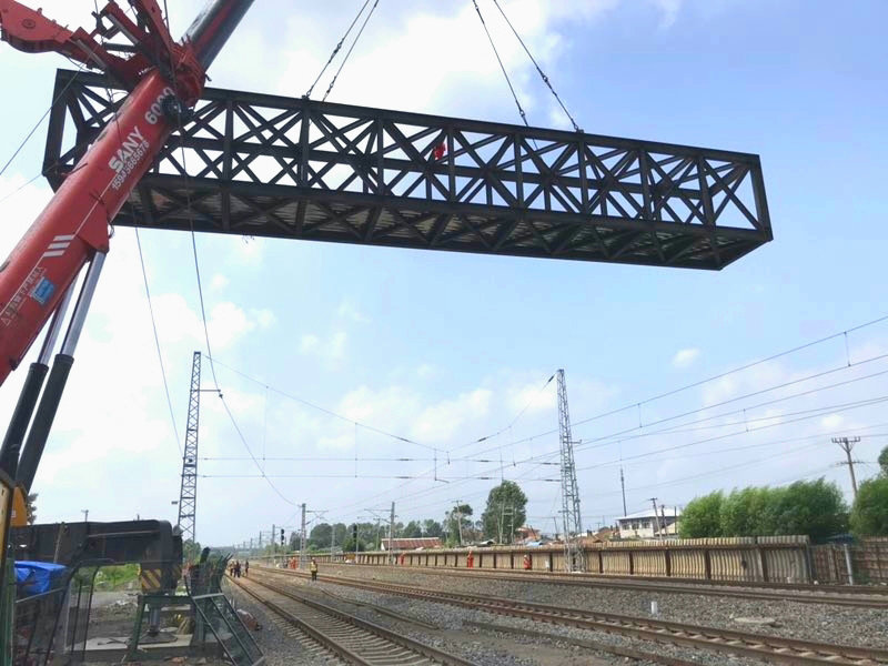 該橋位于濱綏鐵路烏吉密-尚志區(qū)間,橫跨既有電氣化鐵路,地處居民區(qū),場地作業(yè)面狹窄。承擔(dān)施工任務(wù)的中鐵二十三局集團(tuán)哈牡電氣化項(xiàng)目部,克服重重困難,結(jié)合現(xiàn)場實(shí)際,提前準(zhǔn)備、周密部署,與有關(guān)運(yùn)輸站段緊密配合、協(xié)同作戰(zhàn)。牢牢把握鐵路既有線安全防護(hù)、吊裝施工高空作業(yè)等重點(diǎn)環(huán)節(jié),進(jìn)行了超前預(yù)想和風(fēng)險(xiǎn)點(diǎn)防控,把責(zé)任和措施落到實(shí)處。為了確保安全萬無一失,項(xiàng)目部調(diào)集了一臺(tái)600噸重型汽車式起重機(jī),保證了鋼梁架設(shè)施工的順利完成,此舉為加快天橋的下步附屬施工進(jìn)度創(chuàng)造了條件。