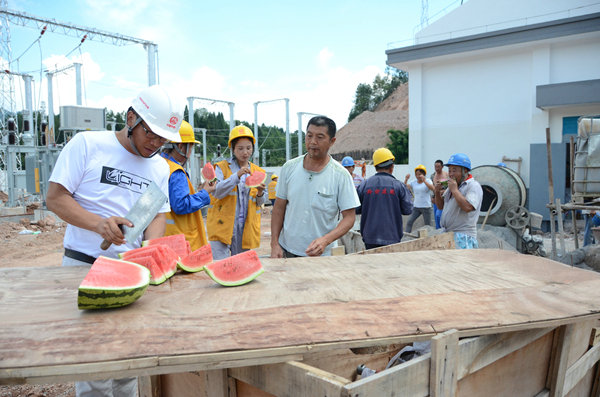 “兄弟們辛苦了,大家先停下手里的活,過(guò)來(lái)吃幾塊西瓜。”陳春林一進(jìn)分區(qū)所大門(mén),便隨便找來(lái)快木板,拿著隨身帶來(lái)的菜刀,開(kāi)始切西瓜。工友們也毫不客氣,感受項(xiàng)目部送來(lái)的絲絲涼意。