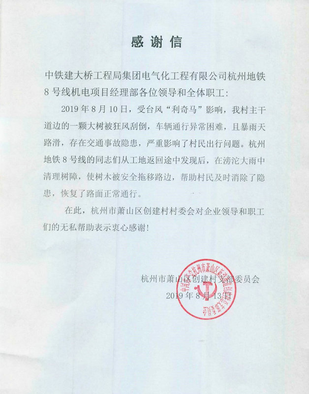 8月13日,中鐵建大橋局電氣化公司杭州地鐵8號(hào)線項(xiàng)目部收到杭州市蕭山區(qū)創(chuàng)建村的感謝信,表彰項(xiàng)目干部職工在超強(qiáng)臺(tái)風(fēng)“利奇馬”侵襲的關(guān)鍵時(shí)刻,用實(shí)際行動(dòng)主動(dòng)協(xié)助地方“抗臺(tái)風(fēng)”,幫助村民清除樹障,表示誠(chéng)摯感謝。