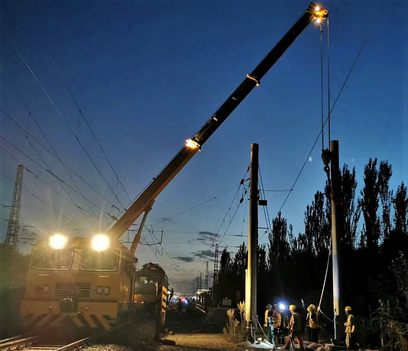 圖為中鐵建大橋局電氣化公司新疆瑪石鐵路項目立起第一根遷改接觸網(wǎng)桿