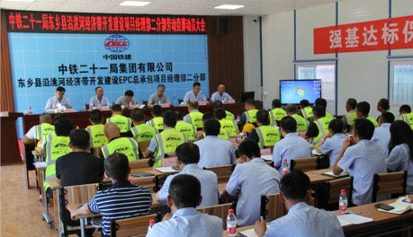8月15日,中鐵二十一局四公司東鄉(xiāng)縣沿洮河經(jīng)濟(jì)帶開發(fā)建設(shè)項(xiàng)目部召開勞動(dòng)競賽動(dòng)員大會(huì),項(xiàng)目部全體干部職工和16家合作勞務(wù)方的代表參加了大會(huì),公司黨委書記、董事長朱昌岳,黨委副書記、紀(jì)委書記杜長松出席動(dòng)員大會(huì)并講話。