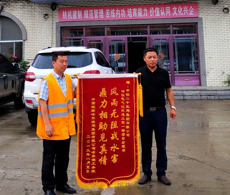 8月22日,中國(guó)鐵路哈爾濱局集團(tuán)有限公司哈爾濱工務(wù)段副段長(zhǎng)李軼群將“風(fēng)雨無阻戰(zhàn)水害、鼎力相助見真情”錦旗專程送到中鐵二十三局哈牡項(xiàng)目部表達(dá)感激之情。