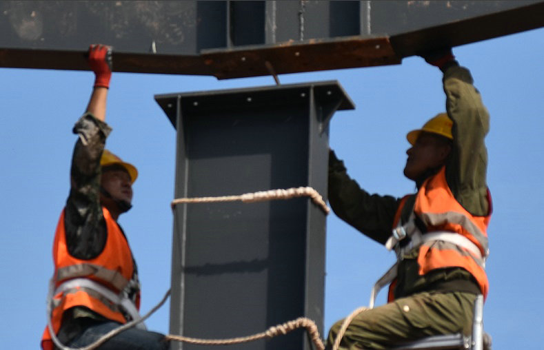 8月23日上午9時(shí)許,筆者來(lái)到正在安裝鋼筋加工廠的廠房主架梁施工現(xiàn)場(chǎng),只見(jiàn)兩名工人在離地面約5米的高空熟練的矯正支架梁與立柱對(duì)接,對(duì)接到位以后迅速進(jìn)行螺栓連接。盡管悶熱的天氣高溫已經(jīng)達(dá)到30多攝氏度,為了防止擦傷皮膚,他們?nèi)匀灰┥虾窈竦墓ぱb,戴上安全帽,系上安全繩。既要忍受高溫的煎熬,又要注意自身安全。他們的吃苦精神讓我感動(dòng),敬佩之情油然而生。