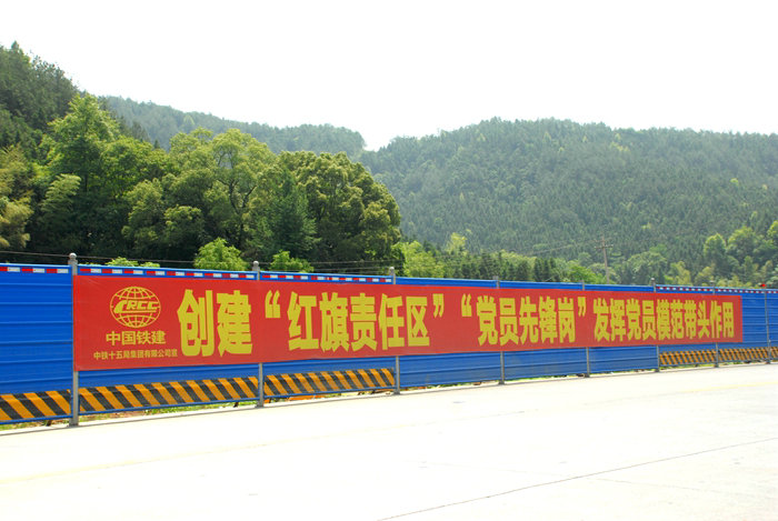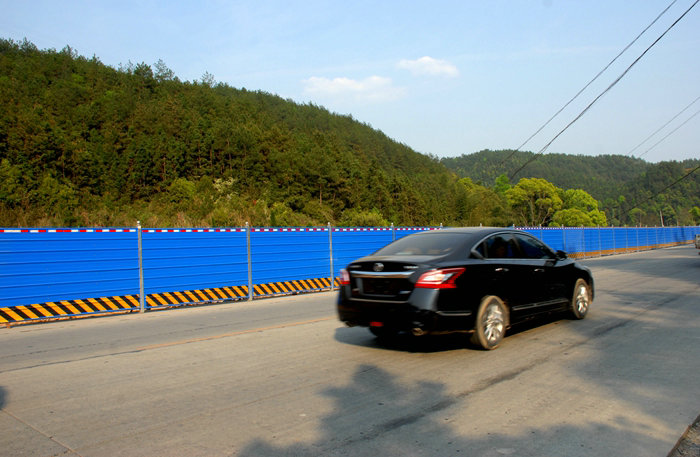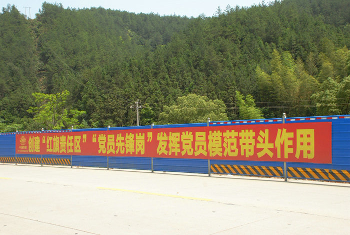 為防止塵土從路面上飛揚(yáng)到路外的樹木、花草上,給植物造成污染,影響生態(tài)環(huán)境美,項(xiàng)目部在主要施工路段兩側(cè)安裝了由鋼管、彩鋼瓦構(gòu)成的圍欄,一舉兩得,既防塵又起到安全防護(hù)作用,在湛藍(lán)色圍欄上懸掛上巨幅環(huán)保等內(nèi)容的標(biāo)語,成為一道亮麗的風(fēng)景,給風(fēng)光旖旎的修水山水增添了一抹亮色,吸引了南來北往的本地、外來人的目光。