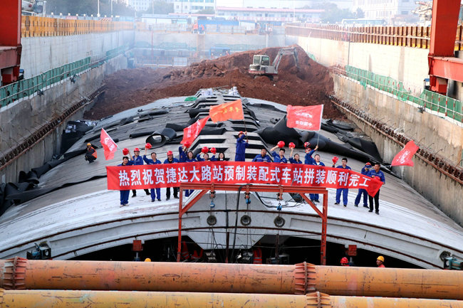 9月25日,17點(diǎn)30分,一片重達(dá)54.3噸、長(zhǎng)10.057米的混凝土預(yù)制件E塊,在80T+80T龍門(mén)吊的吊裝下,在現(xiàn)場(chǎng)技術(shù)人員的精心指揮下,精準(zhǔn)落座在拼裝臺(tái)車(chē)上,工人師傅迅即展開(kāi)調(diào)整就位。至此宣告,由中鐵十四局集團(tuán)承建的長(zhǎng)春地鐵2號(hào)線西延線捷達(dá)大路站預(yù)制裝配式車(chē)站拼裝順利完工。頓時(shí),鞭炮聲和歡呼聲在施工現(xiàn)場(chǎng)響成一片......