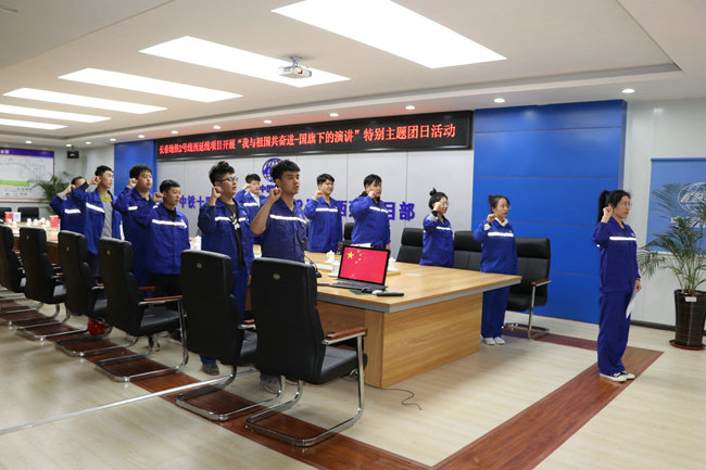 上午7點(diǎn)半,項(xiàng)目部全體團(tuán)員青年穿全身工裝,在國(guó)旗下列隊(duì)集合,舉行了升國(guó)旗、唱國(guó)歌儀式。