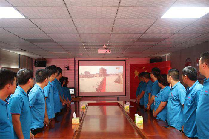 各單位、項(xiàng)目部早上九點(diǎn)三十分就已經(jīng)開始提前布置會(huì)場,全體職工統(tǒng)一穿著整齊工裝,圍坐一堂,共同期待激動(dòng)人心的時(shí)刻。在中牟房建項(xiàng)目部,一面鮮艷的五星紅旗掛在會(huì)議室最前方,當(dāng)莊嚴(yán)的國歌奏響時(shí),所有職工面對國旗,唱響了國歌嘹亮的旋律。在鄭州東四環(huán)、京新高速項(xiàng)目部,在閱兵儀式之前先組織了室外升國旗儀式。隨后,每一位職工手中拿著統(tǒng)一配發(fā)的小國旗,集體在會(huì)議室觀看了閱兵儀式。在阿富準(zhǔn),采石爆破分公司,除了統(tǒng)一組織觀看閱兵。項(xiàng)目上的年輕職工還利用抖音小視頻平臺(tái),拍攝創(chuàng)作了各類創(chuàng)意照片和視頻,與國旗合影,為祖國母親比心。