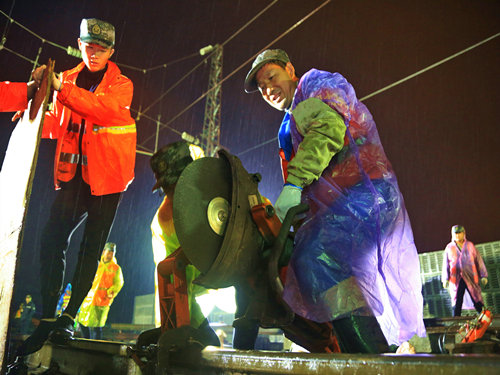 時間一分一秒的劃過,緊張忙碌地施工仍在進(jìn)行,雨水浸濕了雨衣,打透了工裝,貼在身上讓人瑟瑟發(fā)抖,但在那刻,“鐵軍”們似乎忘卻了一切,依舊全身心地投入在作業(yè)當(dāng)中。