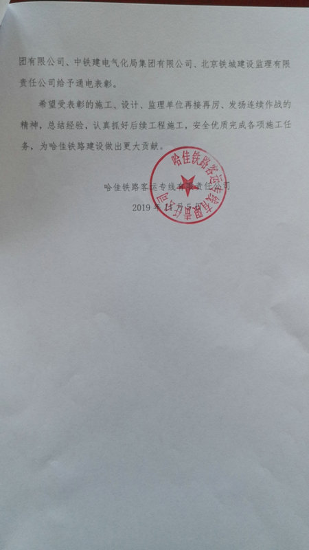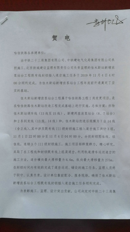 在賀電中,哈佳公司高度肯定了項(xiàng)目部在佳木斯站新增旅客站臺(tái)工程施工過程中克服困難、精心組織、效果顯著,尤其是在封鎖插入道岔施工中取得了優(yōu)異的成績,給予通電表揚(yáng)。此次封鎖施工自11月1日至4日每日22時(shí)至次日04時(shí),進(jìn)行了連續(xù)3個(gè)Ⅲ級(jí)封鎖施工,采取在工程線和封鎖既有線上組裝道岔,利用小型軌道臺(tái)車縱向運(yùn)送道岔、利用滑軌橫向滑移道岔的施工方法,在封鎖時(shí)間內(nèi)有效完成了道岔運(yùn)送、滑移、鋪設(shè)、整道的施工任務(wù),安全正點(diǎn),確保了佳木斯站新增旅客站臺(tái)工程總體施工任務(wù)順利完成。