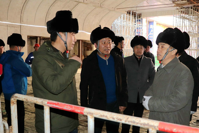 周松(右三)向副總指揮李福民(右一)一行匯報(bào)工程進(jìn)展情況。