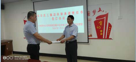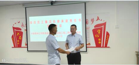 簽訂儀式上,項(xiàng)目部書記鄧正德闡述了承諾書的主要內(nèi)容和簽訂的重要意義,并強(qiáng)調(diào):一是要充分認(rèn)識(shí)加強(qiáng)黨風(fēng)廉政建設(shè),落實(shí)黨風(fēng)廉政建設(shè)責(zé)任制的重要性;二是要嚴(yán)格執(zhí)行黨中央“八項(xiàng)”規(guī)定;三是要求項(xiàng)目全體員工樹立正確的人生觀、世界觀、價(jià)值觀,廉潔奉公、誠(chéng)信守法、愛崗敬業(yè)的職業(yè)道德操守,樹立典型、弘揚(yáng)正氣、傳遞廉潔正能量,營(yíng)造項(xiàng)目部廉潔從業(yè)的良好氛圍,從思想上、精神上時(shí)刻敲響黨風(fēng)廉政建設(shè)警鐘,牢筑黨風(fēng)廉政建設(shè) “防火墻”,做到工程優(yōu)質(zhì),員工優(yōu)秀。