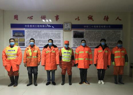 早上六點,項目部門口已是白雪皚皚,昨晚安順地區(qū)連夜降雪,厚度足以沒過雙腳,10名員工安全帽、口罩、手套和反光防護(hù)服全身武裝,間隔一米一字排開。