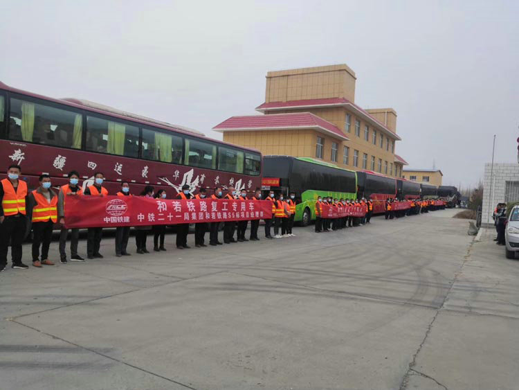 3月13日,中鐵二十一局一公司和若鐵路S5標(biāo)項(xiàng)目經(jīng)理部開啟“一站式”返崗直通車,6輛大巴車從新疆巴州且末縣出發(fā)到甘肅蘭州、甘谷一帶,往返5000多公里接245名民工返崗復(fù)工。