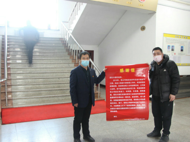經(jīng)過幾天的緊張施工,順利地完成了此項工作,為軌枕公司按期復(fù)工打下了堅實的基礎(chǔ)。為了表達對富拉爾基區(qū)發(fā)改局的由衷感謝,公司領(lǐng)導(dǎo)研究決定向富拉爾基區(qū)政府遞送感謝信和向區(qū)發(fā)改局贈送錦旗,以感謝區(qū)政府部門的“情系企業(yè) 鼎力相助,精準服務(wù) 擔當作為”。