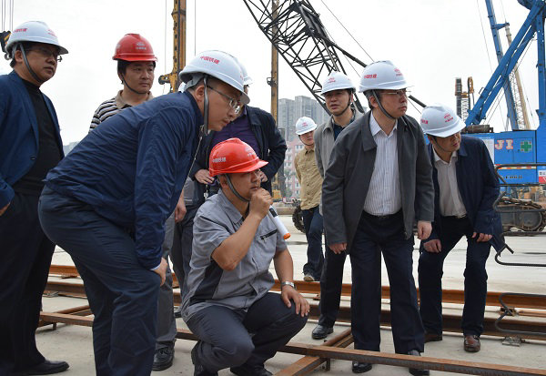 周宏(左2)在現(xiàn)場(chǎng)講解車(chē)站施工技術(shù)