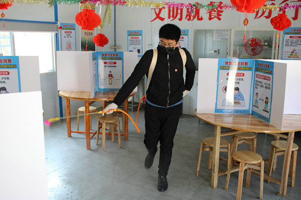 圖2:項(xiàng)目辦公室副主任駱文濤對(duì)食堂進(jìn)行消毒