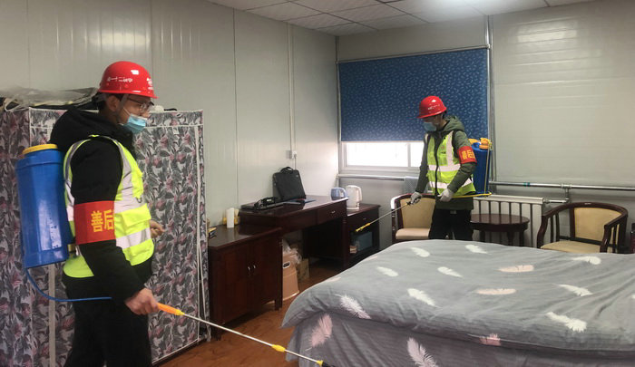 防疫人員為宿舍消毒此次演練有效檢驗了各部門在突發(fā)疑似疫情事件時的現(xiàn)場配合和協(xié)調(diào)作戰(zhàn)能力,進一步提高疫情防控意識和應(yīng)對疫情的應(yīng)急處置能力,為全力打贏疫情防控阻擊戰(zhàn)和安全施工奠定了堅實的基礎(chǔ)。