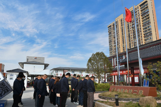 (通訊員 朱紅洲)為表達全國各族人民對抗擊新冠肺炎疫情斗爭犧牲烈士和逝世同胞的深切哀悼,國務(wù)院發(fā)布公告,決定2020年4月4日舉行全國性哀悼活動,中鐵二局五公司312國道項目積極響應(yīng)國務(wù)院以及公司的號召,以沉重的心情悼念為抗疫犧牲的烈士和同病魔抗?fàn)幎湃サ耐麄儭?br /> 4月4日上午10時,伴隨著春日清晨的一縷暖陽,項目部廣場中央的國旗緩緩升起,在場的升旗手和項目部全體員工行注目禮。國旗升到旗桿桿頂,在短暫的定格后開始緩緩下降,項目部全體員工在沉重的氛圍里低頭默哀三分鐘,表達了自己對犧牲烈士和逝去同胞的深切哀思。