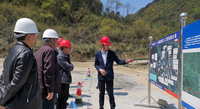 圖為章總等查看施工平面圖 隨后,項(xiàng)目負(fù)責(zé)人雒曉亮向章總反映了2A級(jí)風(fēng)景區(qū)仙人谷施工點(diǎn),二類魚保護(hù)區(qū)徽水河橋施工點(diǎn),征地拆遷較難度大,隧道進(jìn)口出洞口地勢(shì)較高,地形復(fù)雜,施工難度較大等問題。章總建議,征遷工作難度大,但協(xié)調(diào)工作仍要保持推進(jìn),越難啃的骨頭要越用力啃,再難也要想辦法一步步推進(jìn),確保現(xiàn)場(chǎng)施工進(jìn)度不能停。