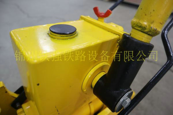 (2)、適當清理軌下道碴,將機具從鋼軌的一側(cè)穿入軌下。如需起道要將起道輪頂在軌下。如要撥道需將起(撥)架的凸起部分卡在軌底一側(cè)。向上關(guān)閉卸荷閥,前后擺動手搬把,就可起道或撥道。