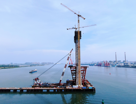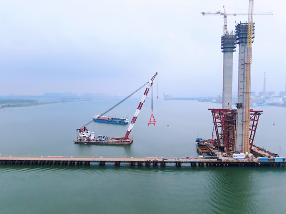 記者在現(xiàn)場看到,主橋目前已經(jīng)進(jìn)行主梁架設(shè)施工,但主塔還沒封頂。