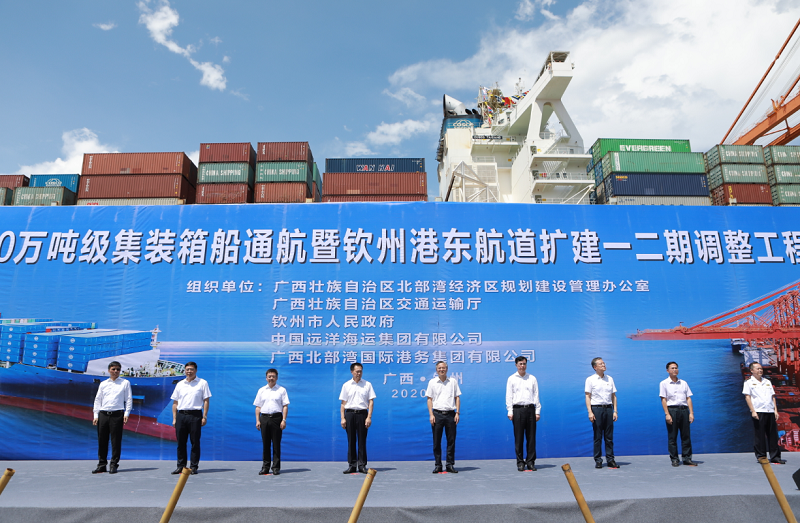 7月30日,由廣西北部灣辦、交通運輸廳、欽州市人民政府、中遠海運集團、北港集團共同舉辦的“欽州港10萬噸級集裝箱船通航暨欽州港東航道擴建一二期調整工程開工儀式”在廣西自貿試驗區(qū)欽州港片區(qū)大欖坪南作業(yè)區(qū)隆重舉行。廣西壯族自治區(qū)副主席周紅波宣布——欽州港10萬噸級集裝箱船通航,東航道擴建調整工程開工!