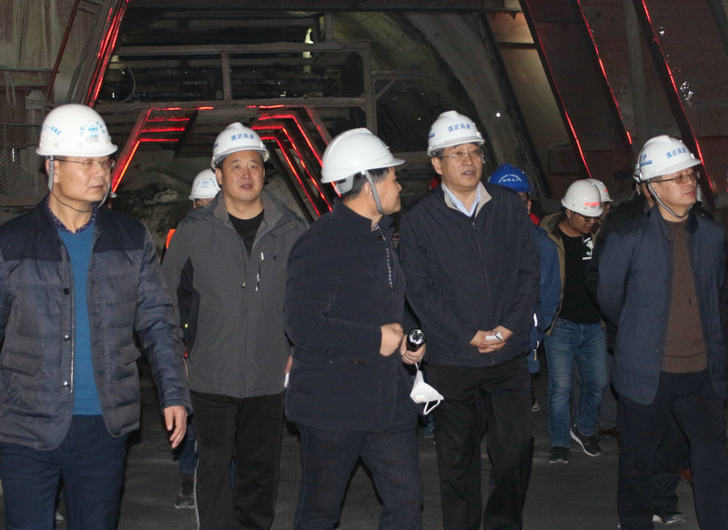 甘肅省公航旅董事長、黨委書記榮志遠(yuǎn)(左四)在3#斜井掌子面觀摩