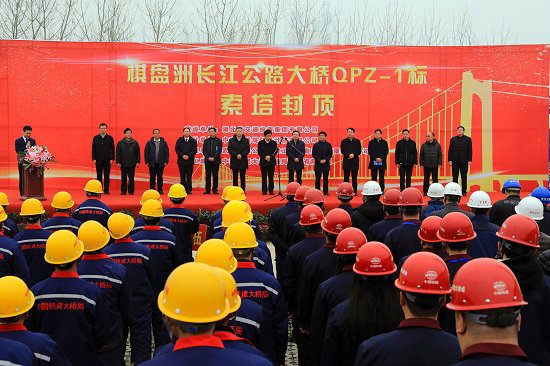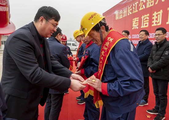 儀式上,蘄春縣人民政府副縣長李國忠致辭;湖北棋盤洲長江公路大橋有限公司副總經(jīng)理、總工程師趙文藝致辭,中鐵建大橋工程局集團一公司執(zhí)行董事、黨委書記王學民致辭;蘄春縣政協(xié)主席蔡緒銀、湖北棋盤洲長江公路大橋有限公司副總經(jīng)理汪應軍、中鐵建大橋工程局集團橋梁指揮部副指揮張耀為3名“最美工匠”頒獎;湖北棋盤洲長江公路大橋有限公司董事長、總經(jīng)理汪西華宣布北索塔最后封頂。